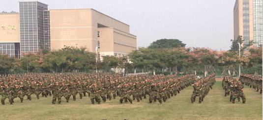 连绵不断的秋雨依然阻挡不住2014级新生军训坚定的步伐。风雨中,他们站军姿,像一棵棵挺拔的松树一样屹立在操场正中;走正步时,一次又一次的抬腿、摆臂,胳膊麻了、腿酸了,但是他们依然在坚持;在军体拳方阵中,嘹亮的口号、有力的出拳、坚实的马步,这不是军训,这是一场真正的战斗!教官们亲身示范,每一位同学睁大眼睛看着,害怕错过每一个动作要领。这不仅是一种坚持的精神,更是一种学习的意识!
