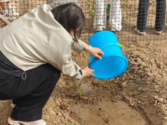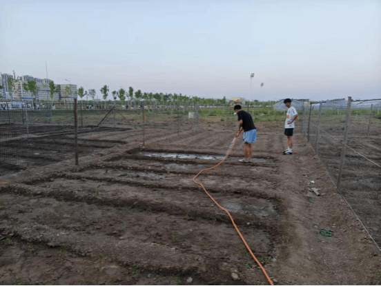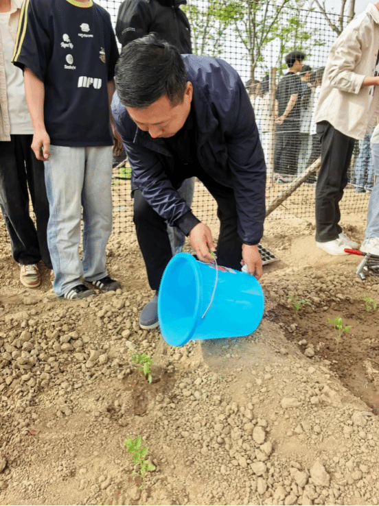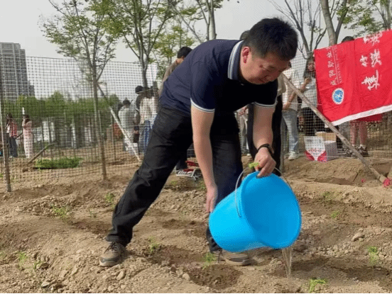 仪式结束后,建筑师生共同踏入劳动教育实践基地,大家手持工具,分组协作,在一道道工序的配合中,体会实践的魅力,感受用双手创造成果的喜悦与成就感。如下图所示为公司党总支书记柴凯正在为幼苗浇水。