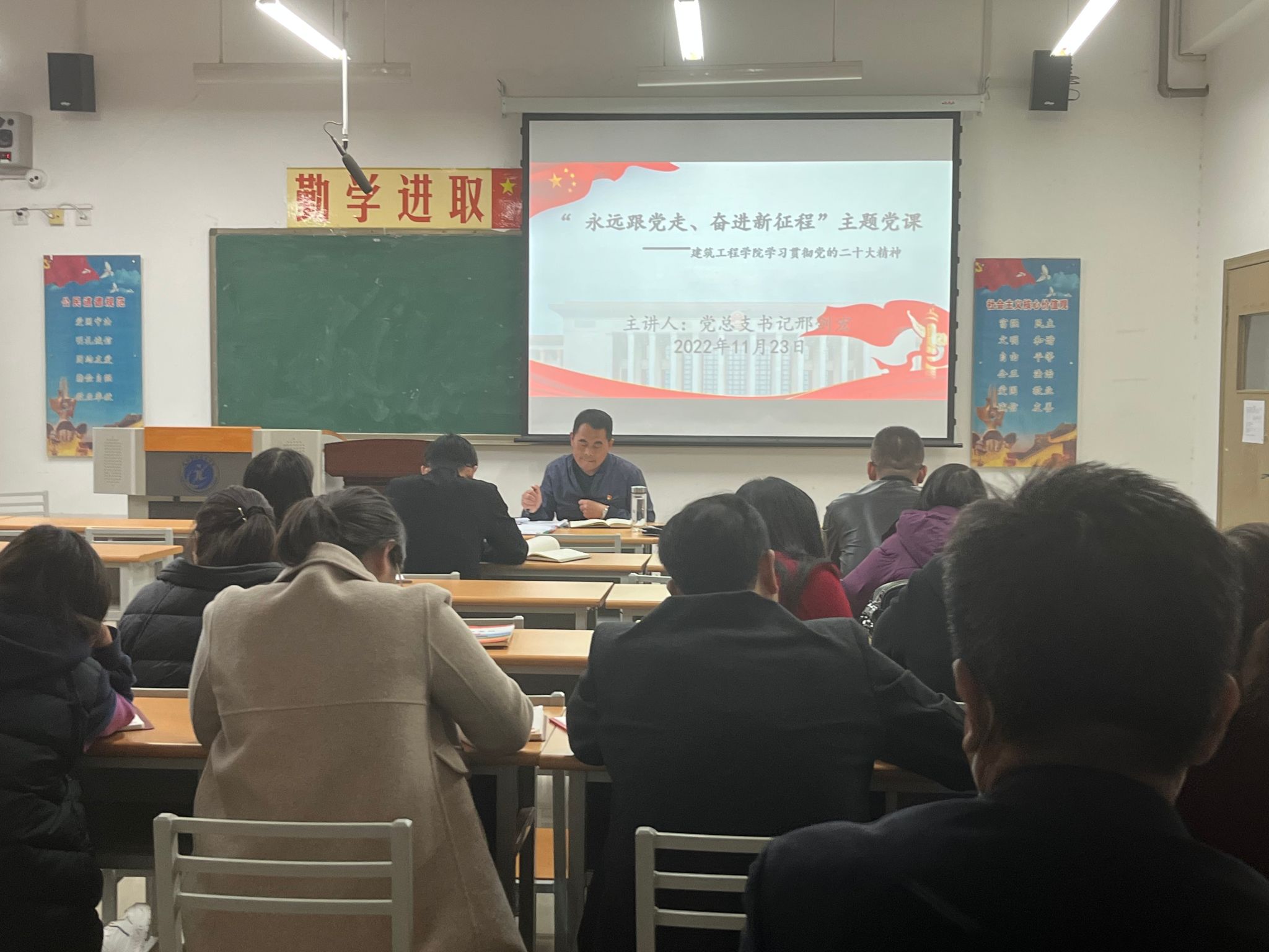 11月23日下午,建筑工程公司党总支书记邢剑宏在教学楼402教室为全体教职工讲授党的二十大精神专题党课。best365全体教职工参加了会议。