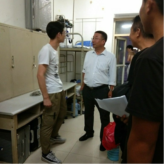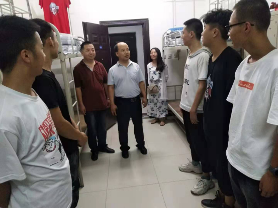 在看到同学们将宿舍打扫的干干净净,物品摆放整齐时,两位领导对同学们独立生活的能力给予了充分肯定。经理雷海涛在看望新生时鼓励大家积极融入老员工活,扎扎实实学习好专业文化知识,做好人生规划,不辜负家长和老师的殷切期望,刻苦成才。如图1为建筑公司经理雷海涛正在宿舍看望2019级新生。